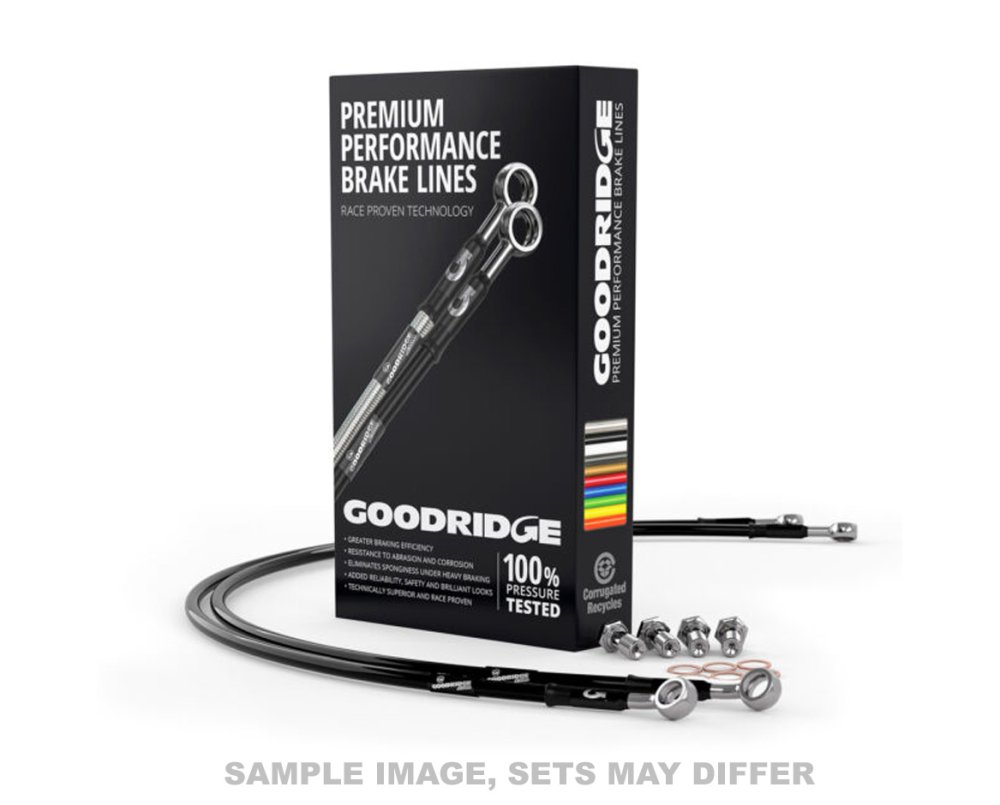 High performance stainless steel braided brake line kit for Suzuki GSX1400 01-09. Goodridge stainless braided brakelines are the standard in professional motorsports where the ultimate in braking is required. Goodridge brake hoses increase breaking efficiency and removes the spongey feel under arduous conditions. With an unmatched reputation backed by champions worldwide, there is no reason to choose anyone else.