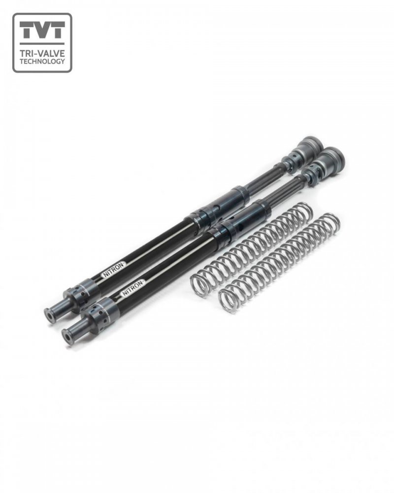 Nitron TVT Adjustable Fork Cartridge Kits offer the same level of improvements in rider control, performance and comfort that have become the trademark of the Nitron product. The system features a large bore 25mm piston which provides significant improvements in performance over the OEM set up. Independent adjustment of rebound (right fork) and compression damping (left fork) is both easy to use and extremely effective. In addition to this, a key feature of the TVT Fork Cartridge Kit is the third, high speed damping valve incorporated into the compression cartridge. The valve is pre-set to react to high-speed, hard edge bumps which normally unsettle a well damped set up especially when combined with hard braking and cornering forces.