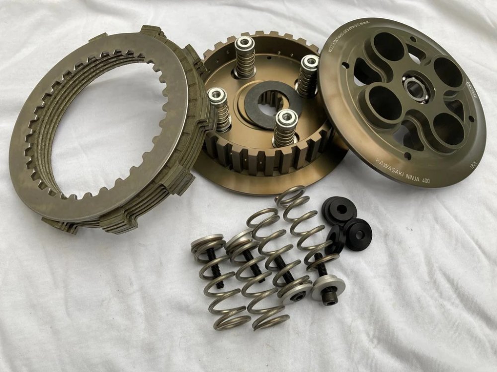 Kawasaki’s little Ninja 400 is the king of Junior Supersport.. it needs a decent set up and a good slipper clutch… The standard clutch isn’t much good for racing but it does handle the torque quite well. Most aftermarket slipper clutches struggle with the torque, not on a dyno but certainly on gear-changes with a quick-shifter. There the torque spike from the shift overpowers the clutch. This clutch was our first design for the Junior Supersport class and will provide excellent slipper action ‘on track ‘ but with only 4 springs and the standard plates isn’t recommended for a quick-shifter equipped bike, for anything else however it will be a great addition to the bike. The clutch gives you all the usual slipper clutch benefits, greater stability into corners, more grip through them and some defence against engine damage from over-revving!
