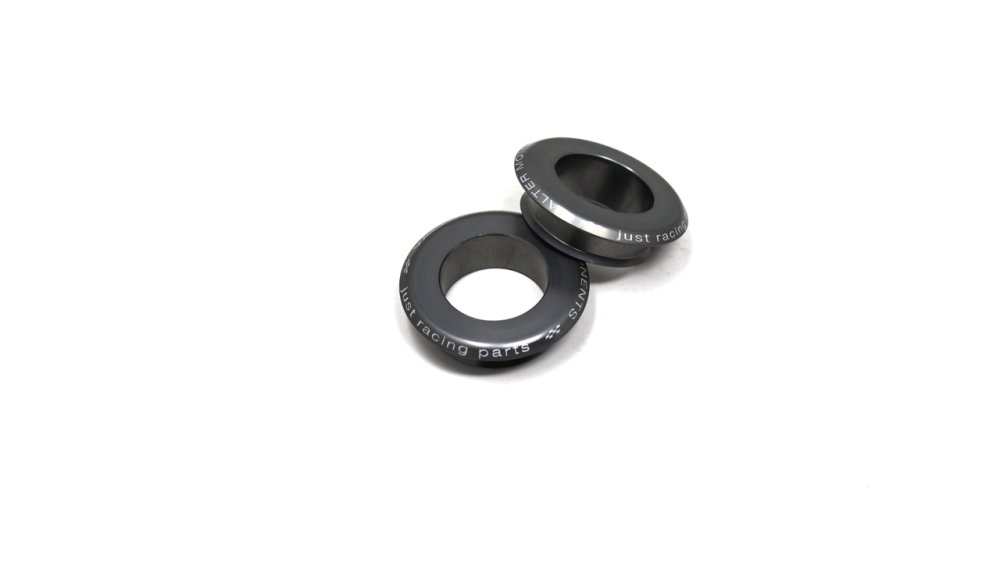 A pair of Valter Moto special front rim spacers, directly required by the world of racing teams, these special spacers have been developed remain in the right position during wheels removing operations. They are made with Ergal 7075 using CNC turning machine. Available in Titanium Colour only.