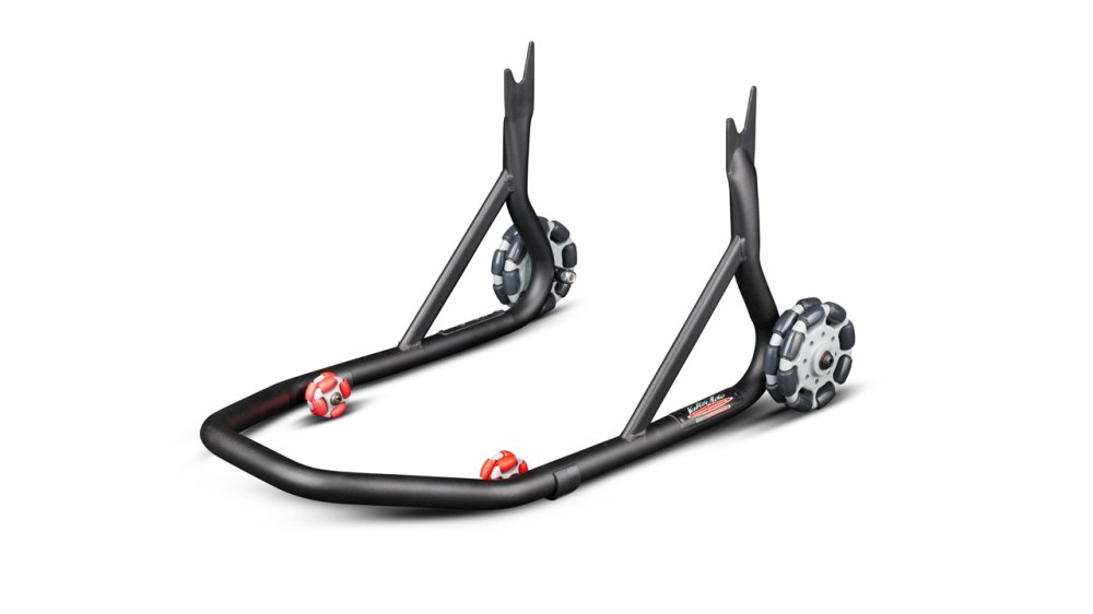 Rear pivoting stand is made with steel with a strong reinforced arm. It is painted with a special embossed long life powder coating. Is equipped with two gray/black large wheels and two wheels grey/red. Useful for moving the bike in small spaces.