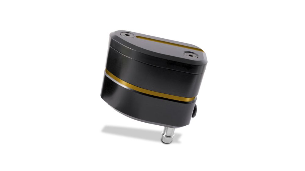 This Street clutch oil tank is entirely made in Aluminum alloy CNC machined to have the product best quality. Made on a VMC design is available in black with colored inserts. On one side there's the oil level check window. Two different exit tube connections, one lateral and one on the bottom. Aluminum cap is also black with colored inserts.