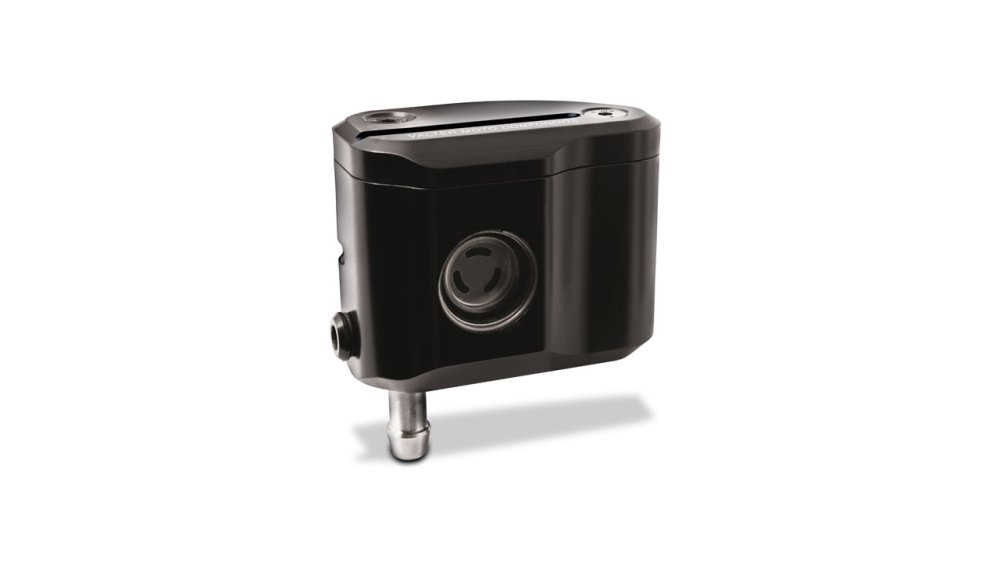 This Street brake oil tank is entirely made in Aluminum alloy CNC machined to have the product best quality. Made on a VMC design is available in black with colored inserts. On one side there's the oil level check window. Two different exit tube connections, one lateral and one on the bottom