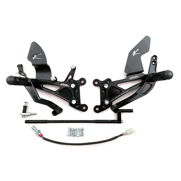 Adjustable Type 1.5 rearsets are developed for street/racing use, entirely made with CNC machinery in Ergal 7075 T5 alloy. Footpegs and frontpegs are made in aluminum alloy machined to obtain an optimal grip. Shift and brake levers are mounted on two ball bearings to avoid any friction. Adjustable plates allows from 6 to 9 different positions to find the best feeling on the bike. Rearsets are provided with black aluminum heel protections, the correct length shift rod, shift and brake ball joints, brake light pressure switch.